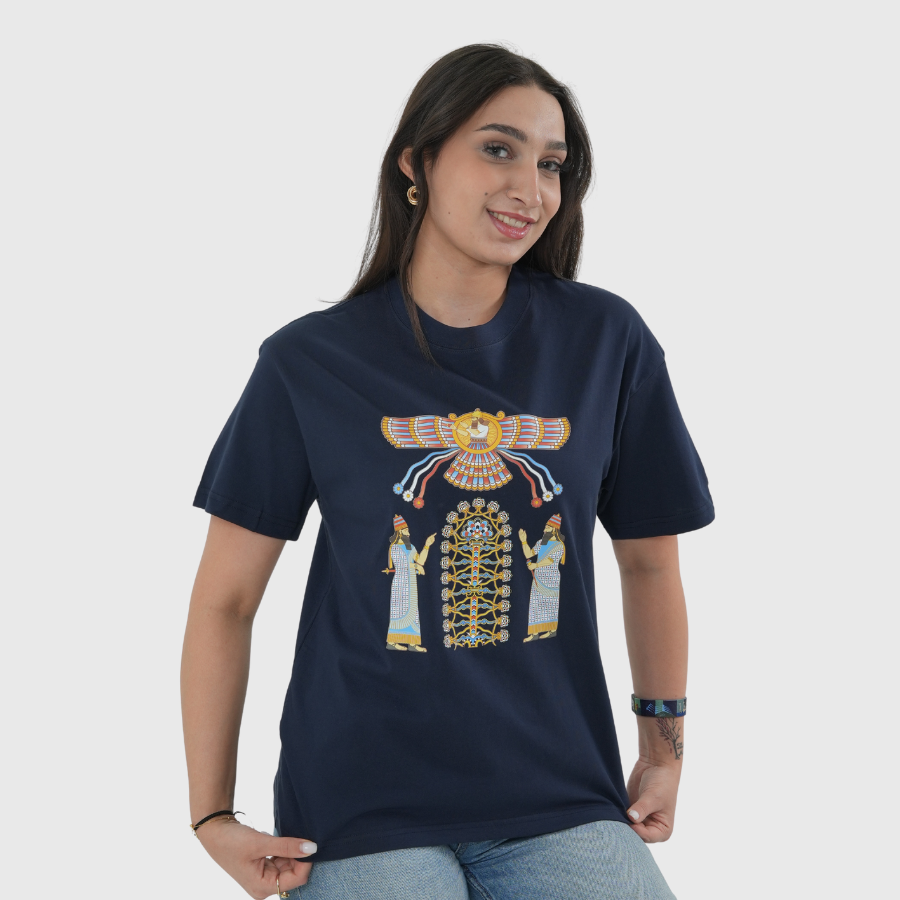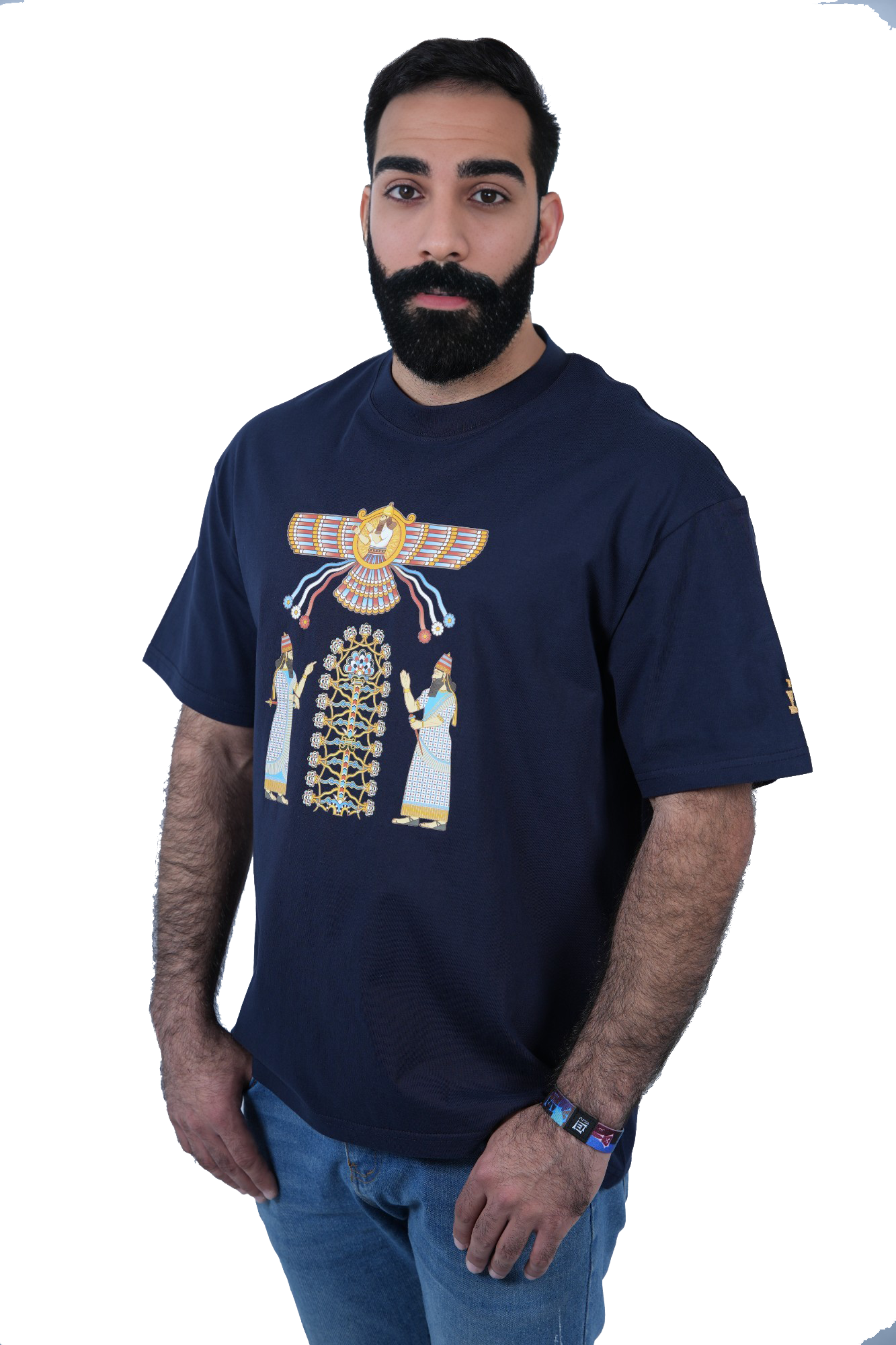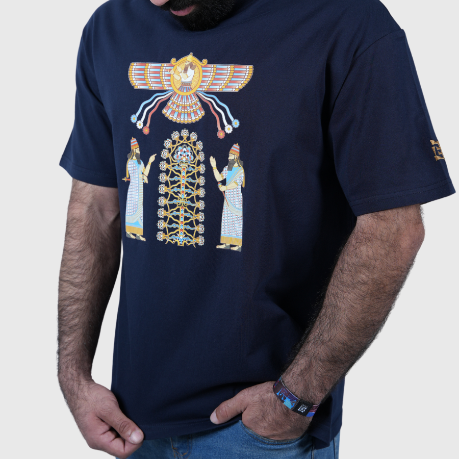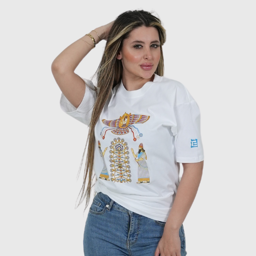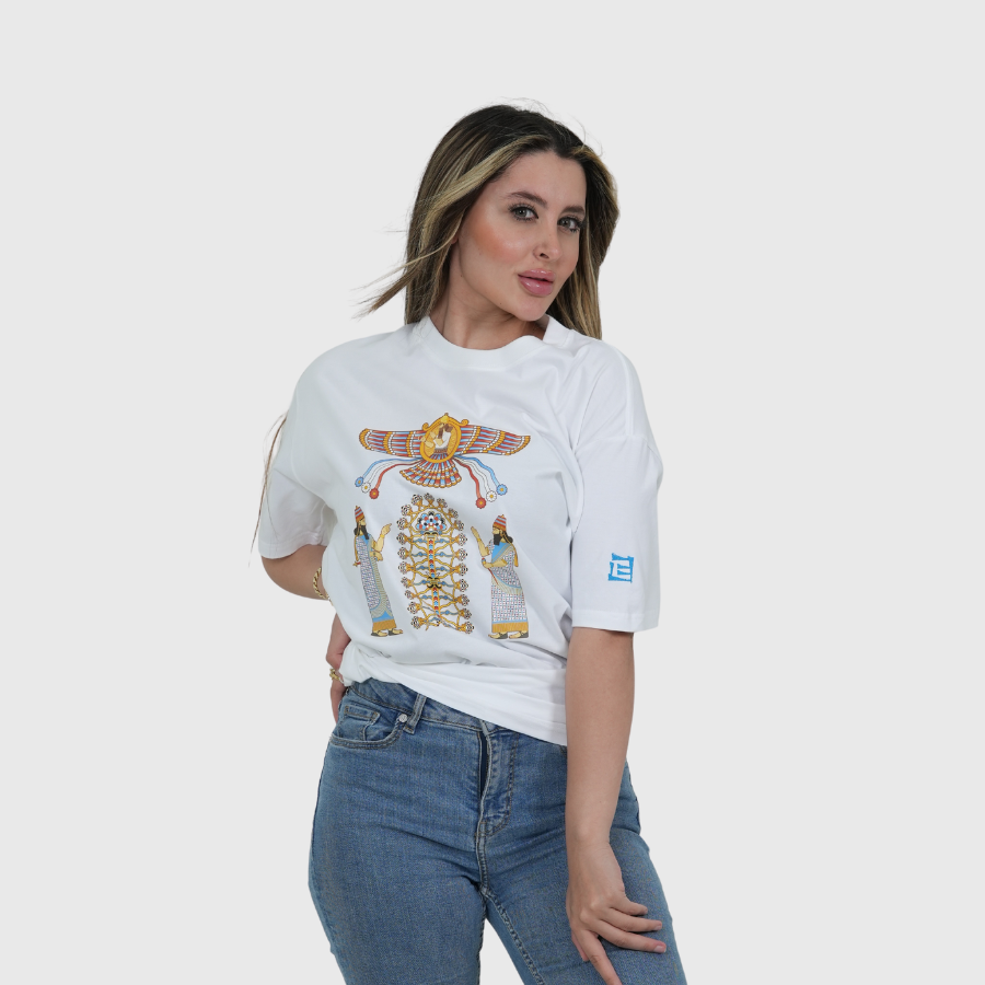 ارتدي قطعة من تاريخ بلاد الرافدين مع تيشيرت “شجرة الحياة” المصنوع من القطن الطبيعي 100%، والذي يجسد رمز الخصوبة والتجدد. يأتي هذا التصميم الأنيق والمناسب للجنسين في علبة فاخرة مع سوار مستوحى من حضارتنا العريقة، ليضيف لمسة أصيلة إلى إطلالتك.